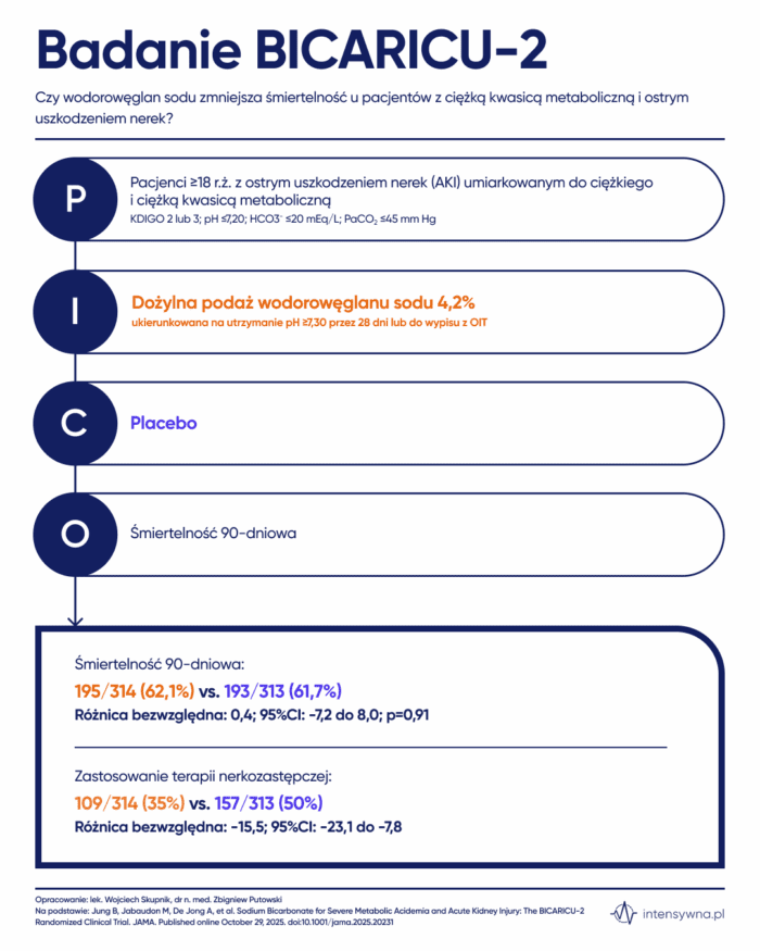 Czy wodorowęglan sodu zmniejsza śmiertelność u pacjentów z ciężką kwasicą metaboliczną i ostrym uszkodzeniem nerek?